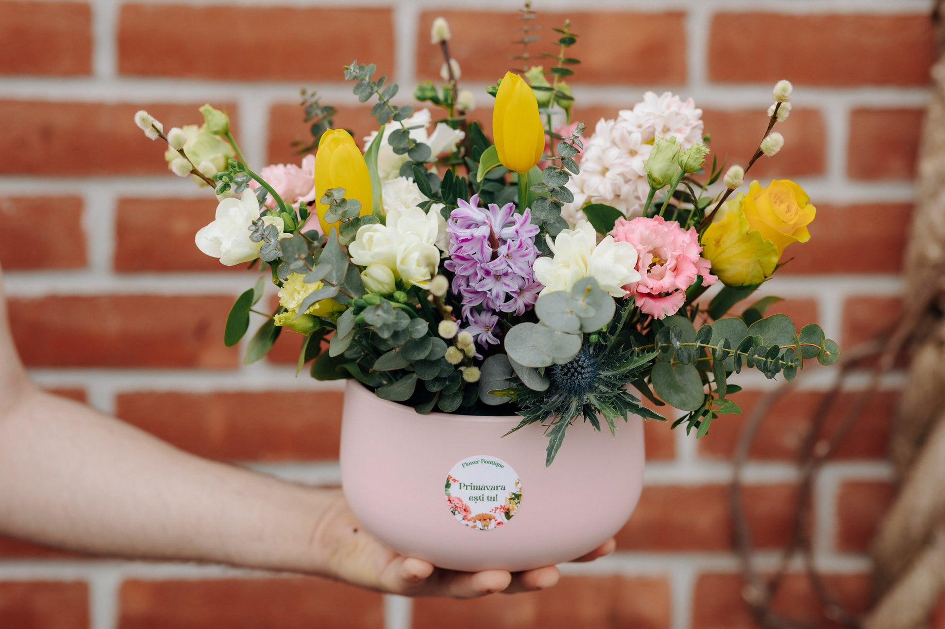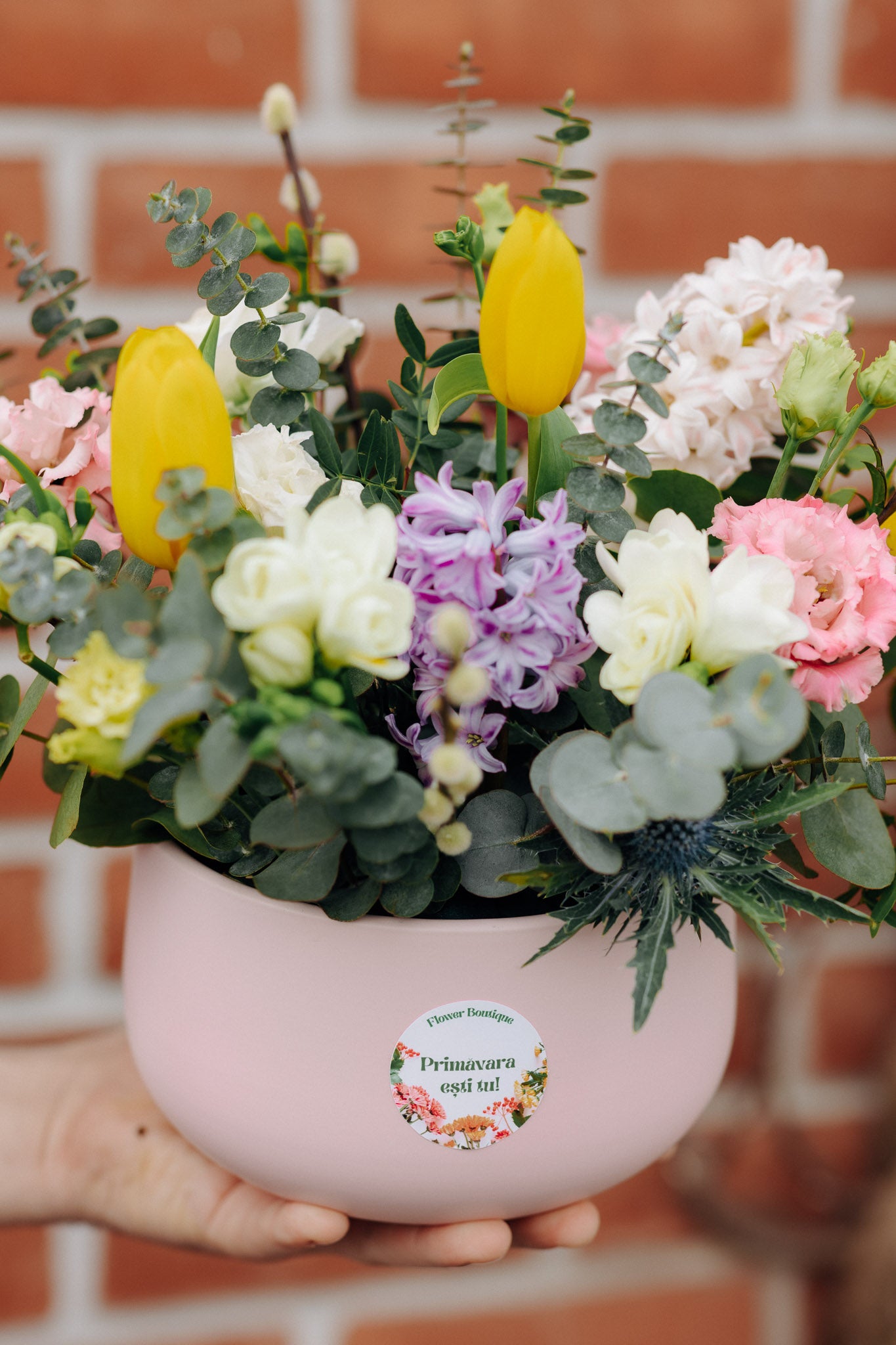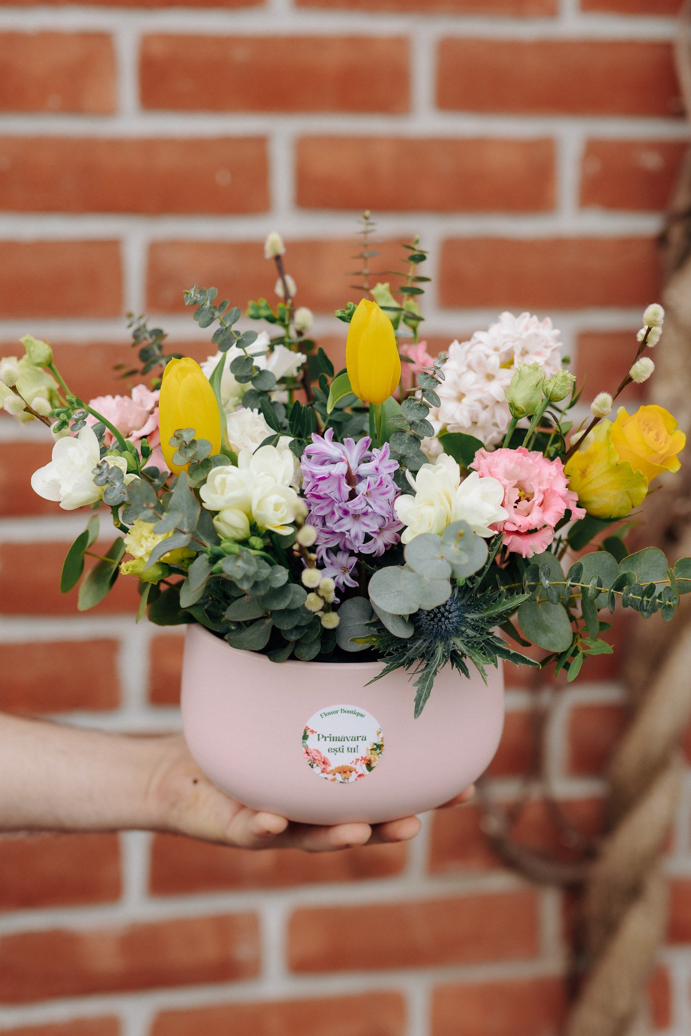 Conține: Vas ceramic, Lalele, Zambile, Lisianthus, Frezii, Trandafir, Eucalipt, Mâțișori + Felicitare