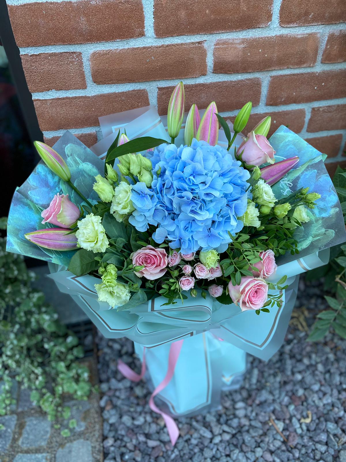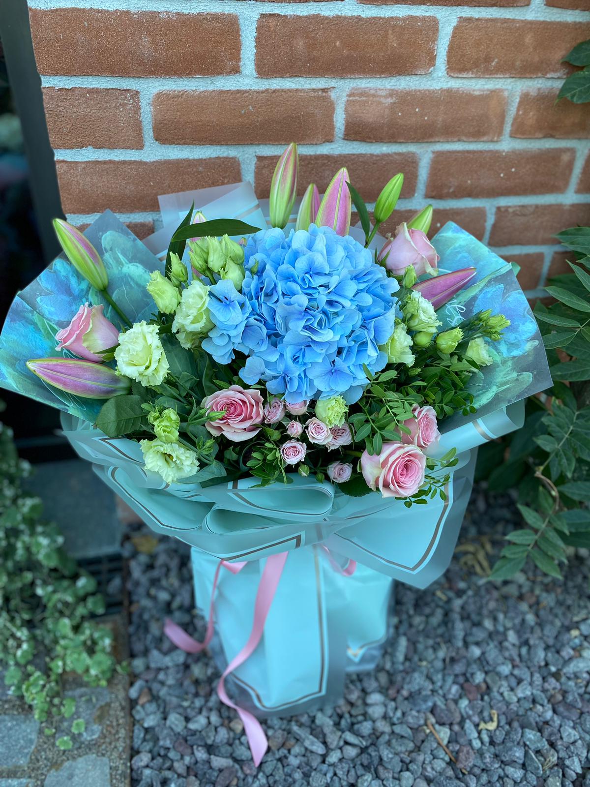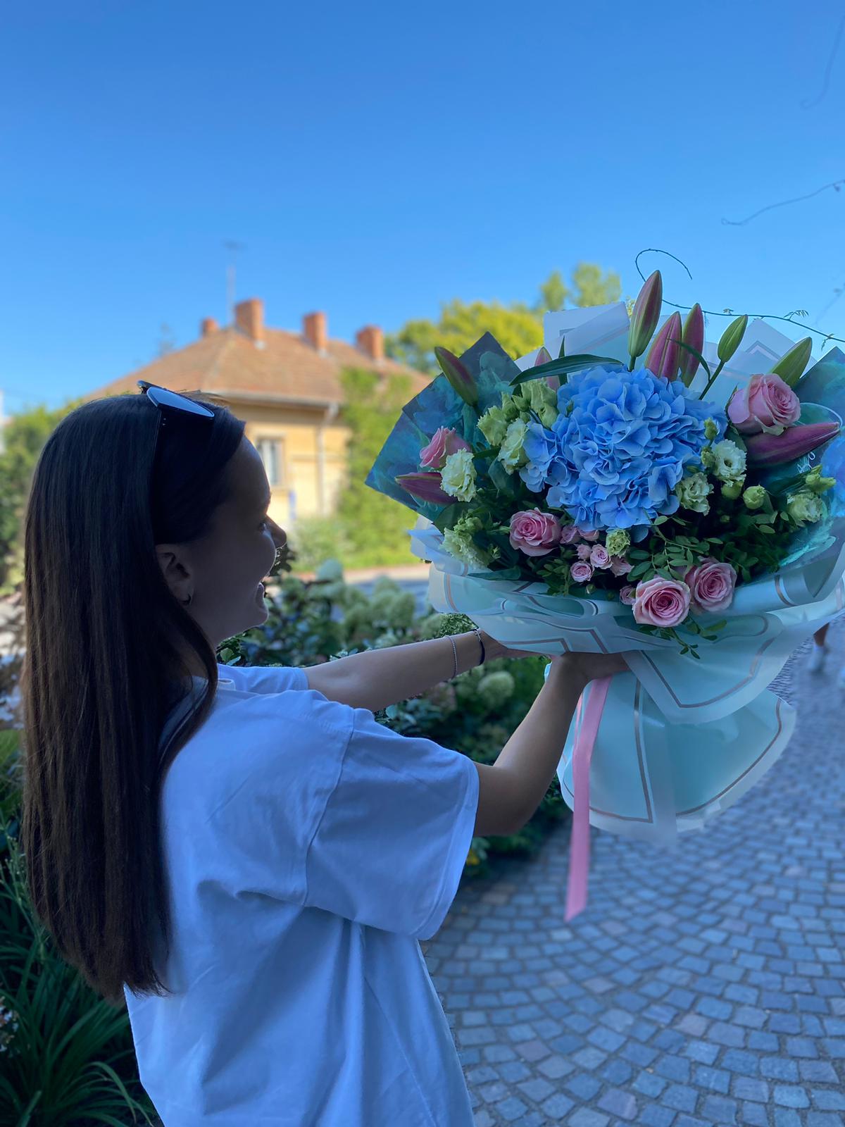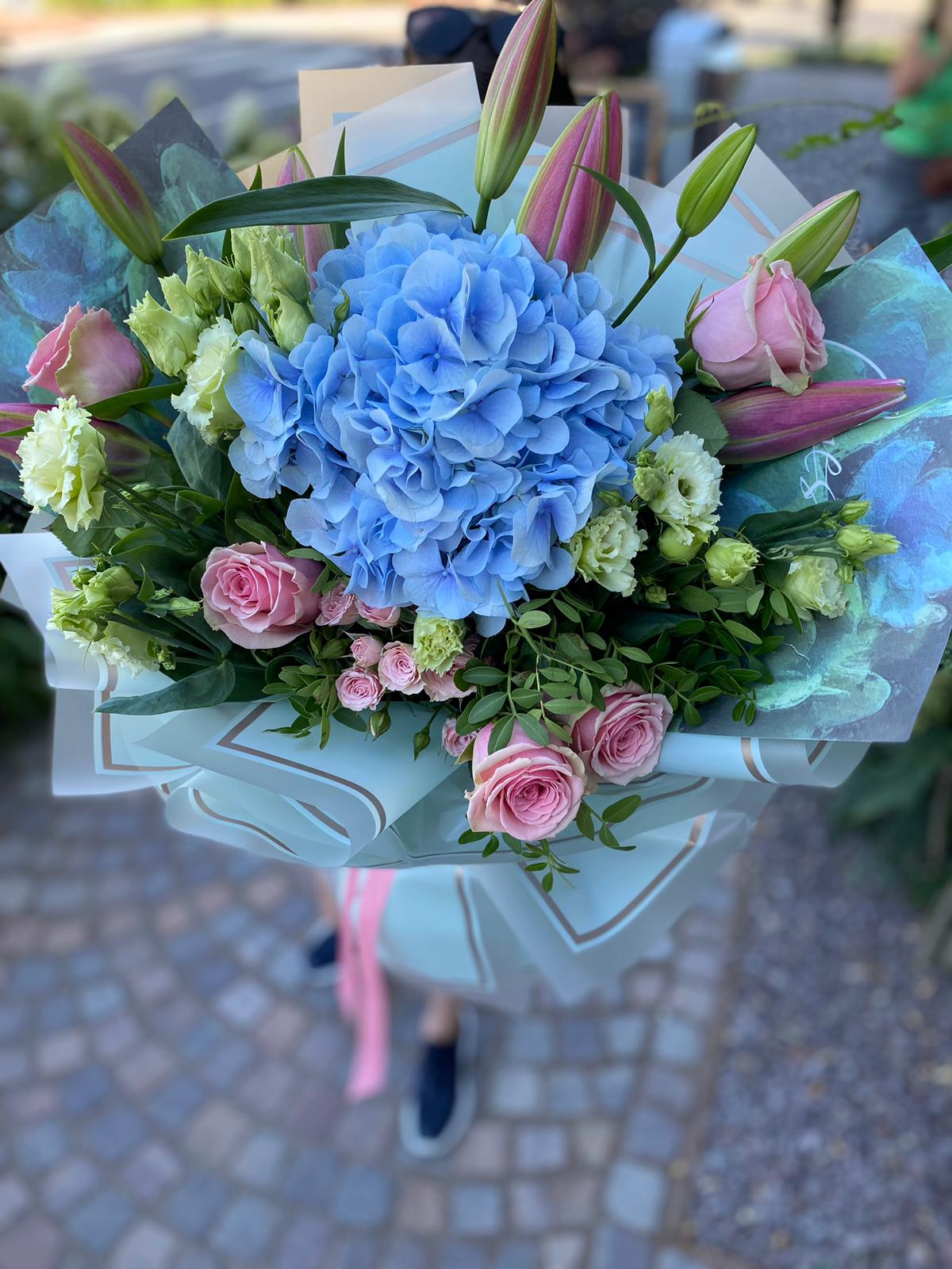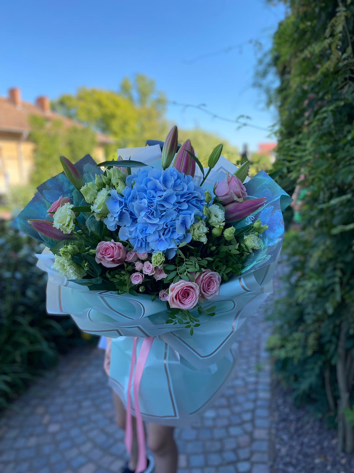 Conține: Trandafiri, Eustoma, Crini, Hortensie, Pistacia + Felicitare