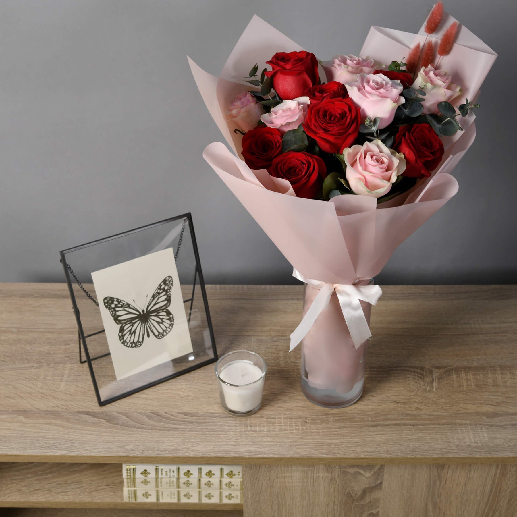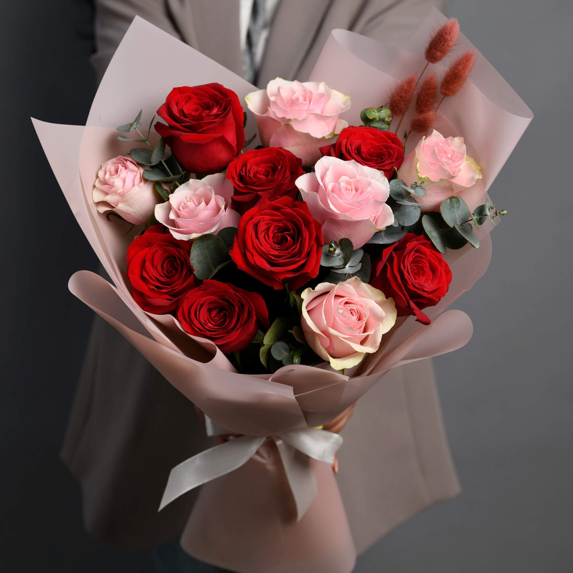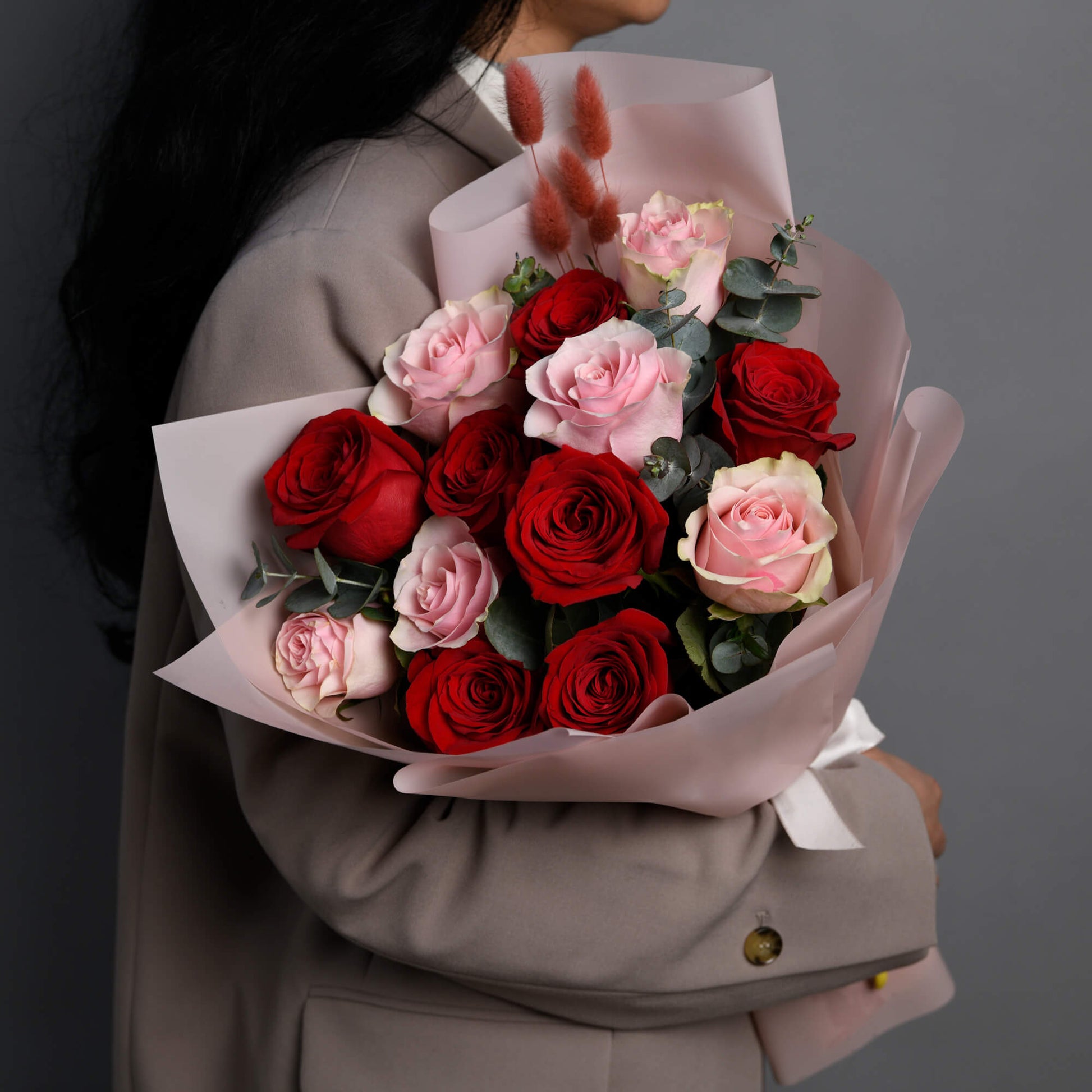 Conține: trandafiri roșii și roz de înalte calitate și eucalipt, ce compun un buchet impresionant.