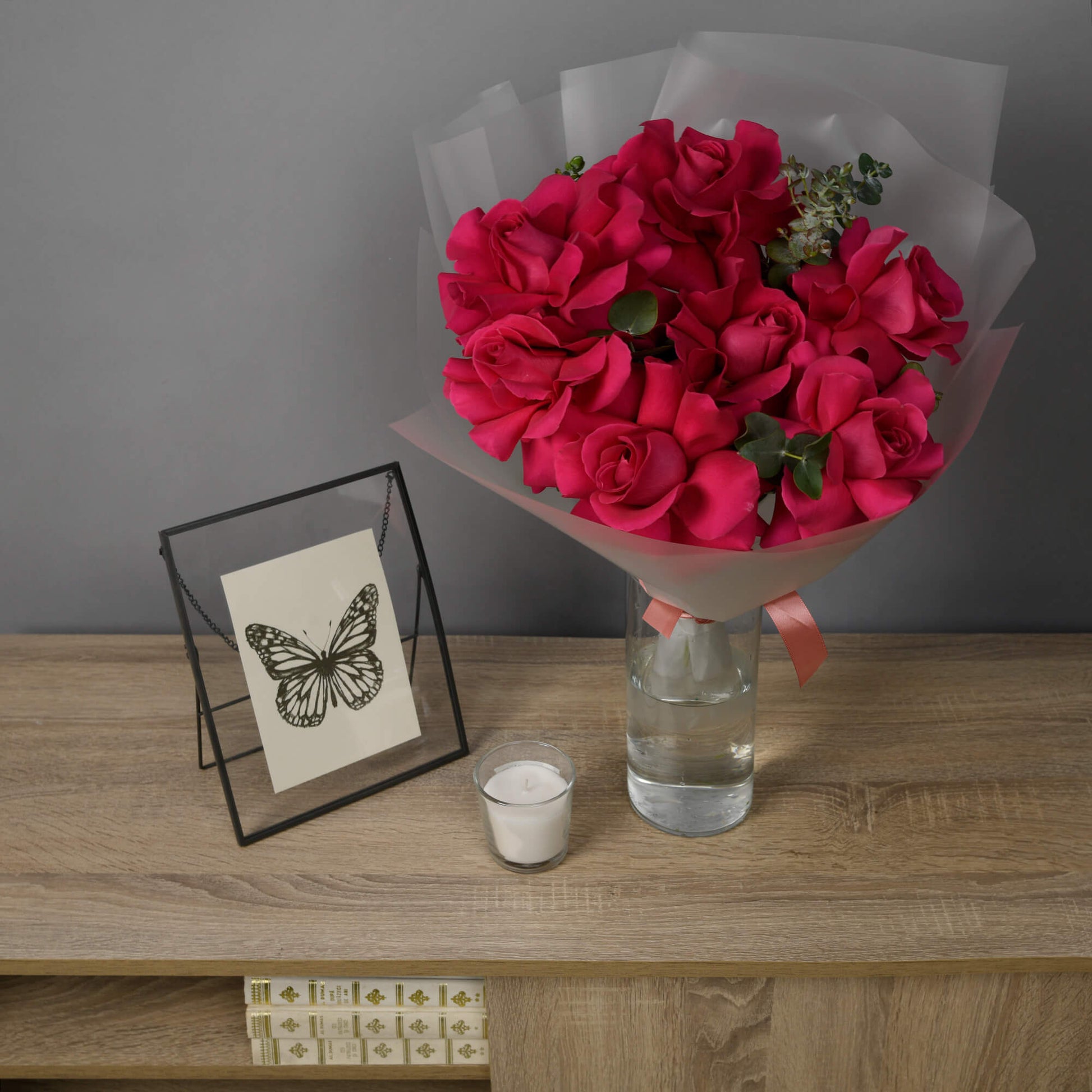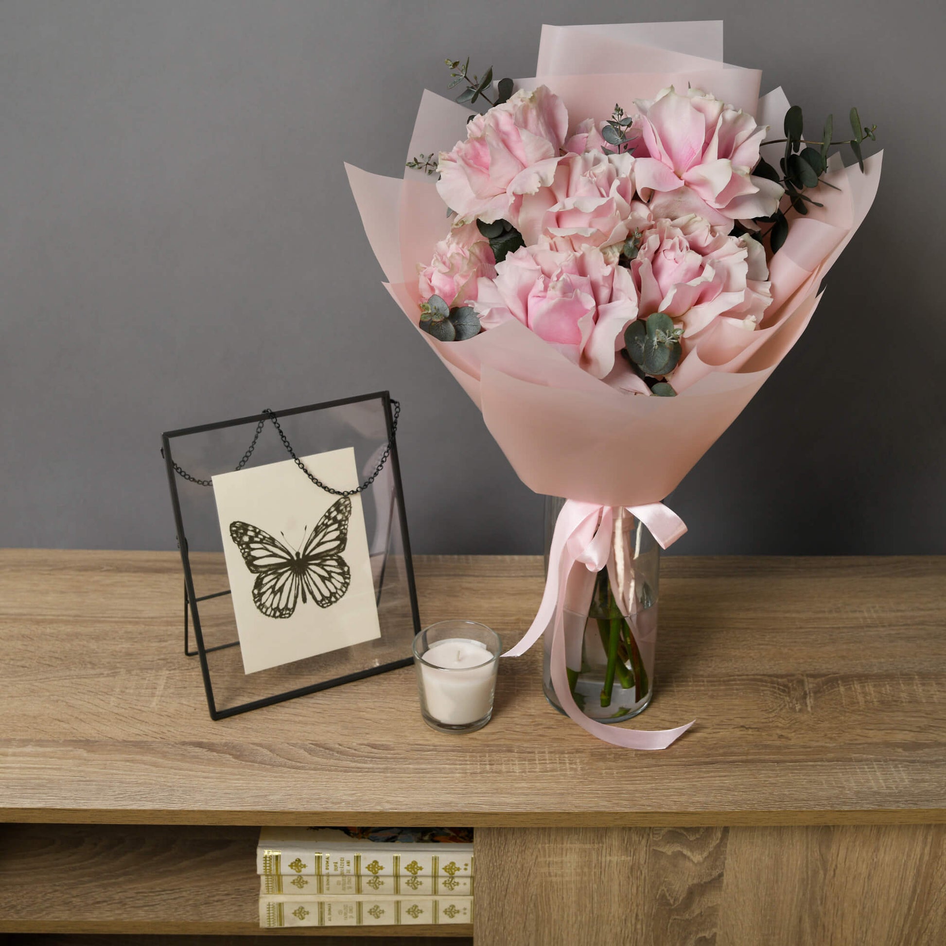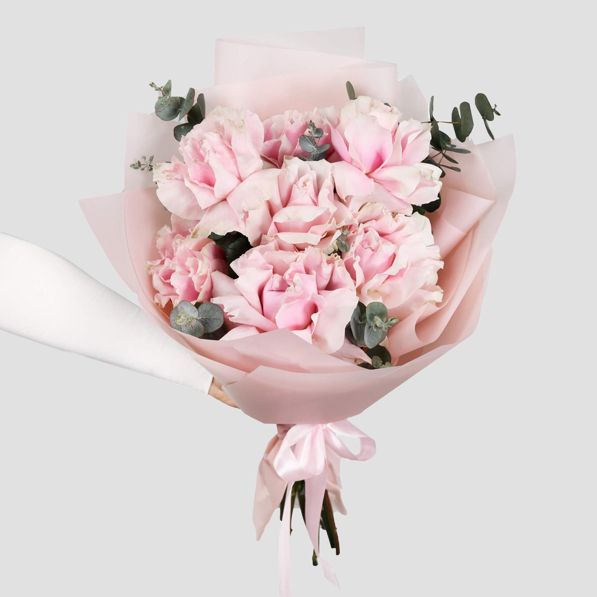 Conține: trandafiri roz de înaltă calitate și eucalipt, ce compun un buchet impresionant.